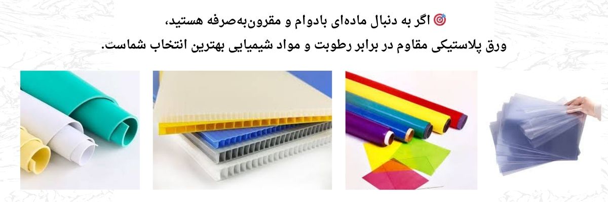 - ورق پلاستیکی پلیپروپیلن: مقاوم در برابر مواد شیمیایی و دارای انعطاف مناسب، مناسب برای بستهبندی و صنایع غذایی